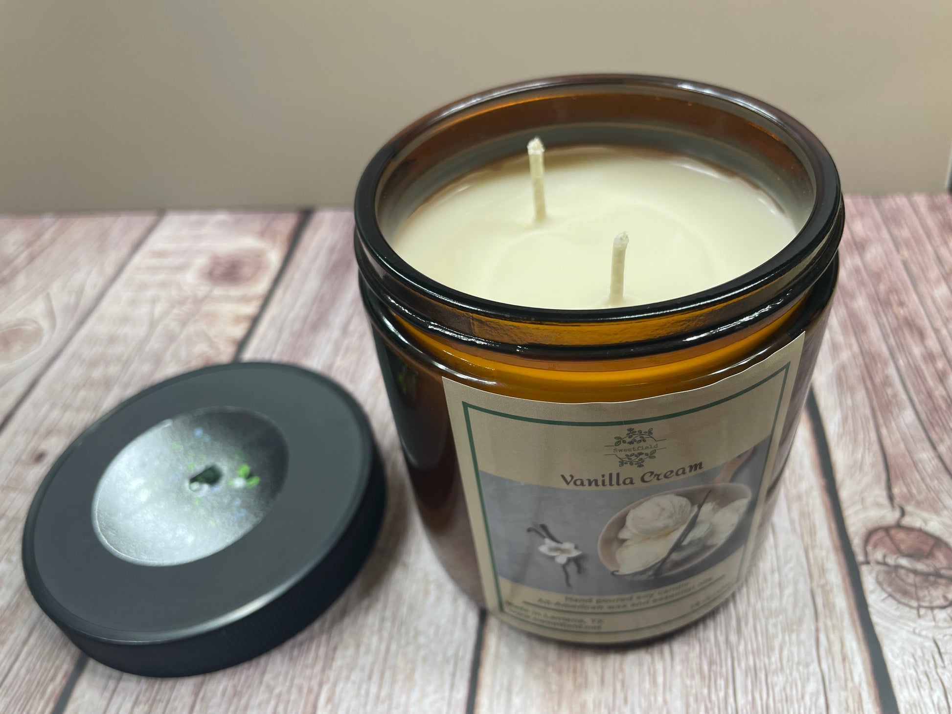 Experience the warm and indulgent scents of french vanilla, white chocolate, and smooth vanilla bean with our Vanilla Cream Candle! Hand-poured in Texas with all-American soy wax and essential oils, this 16oz jar candle offers up to 80 hours of burn time. No phthalates or paraffin additives included, and vegan and cruelty free.